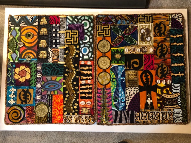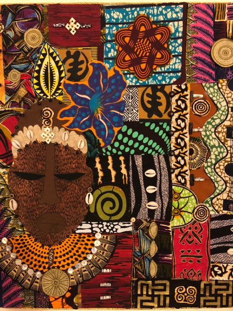Adinkra symbols which were used by the Akan people of Ghana in important ceremonies on cloth, jewelry and prestige objects are used in the multimedia collage.