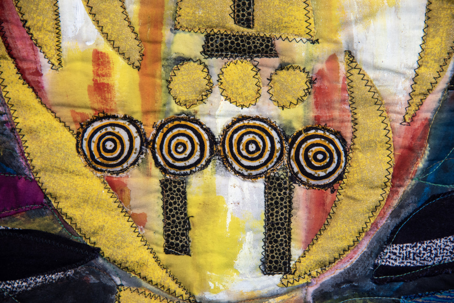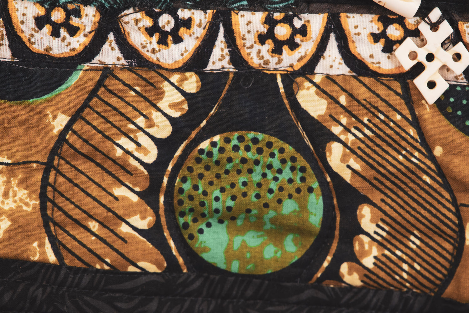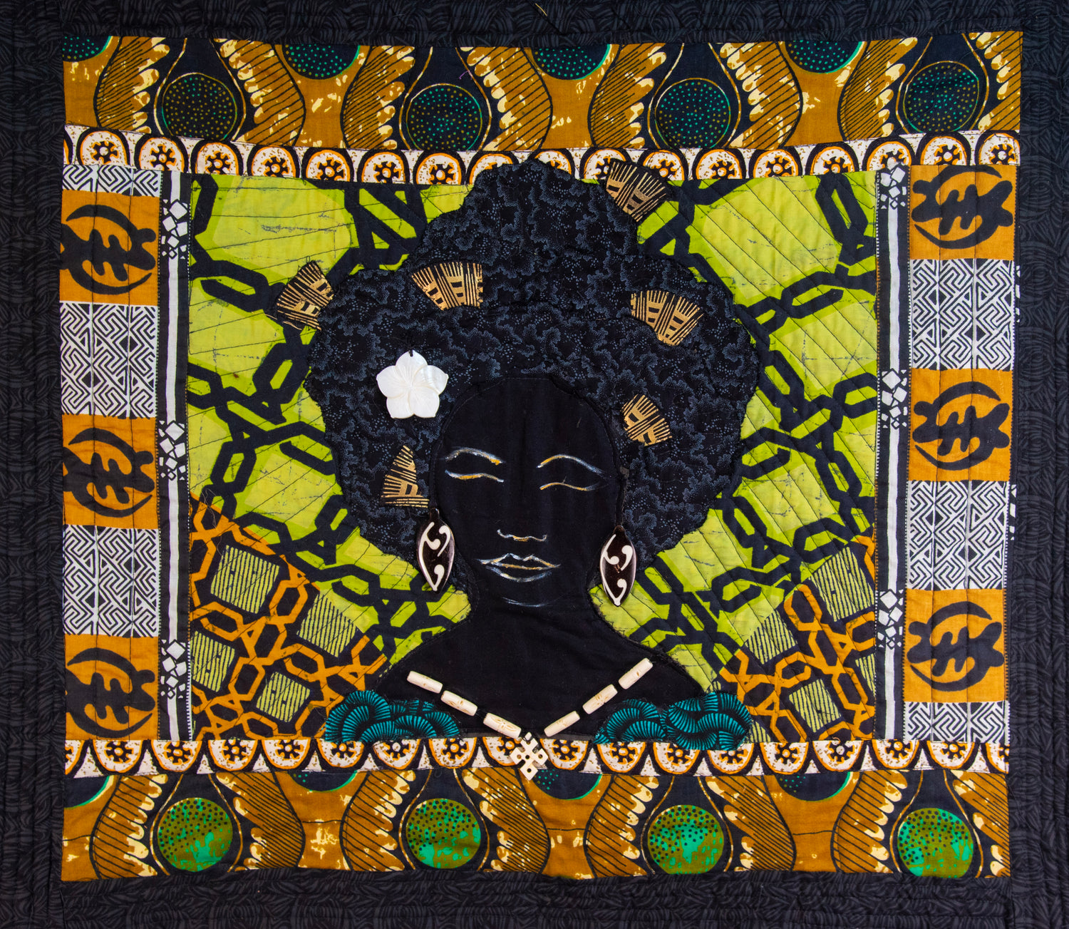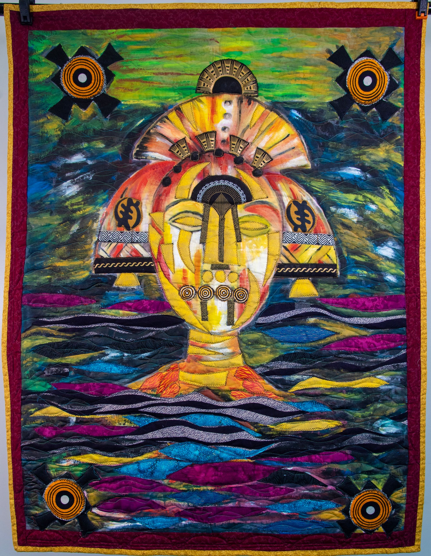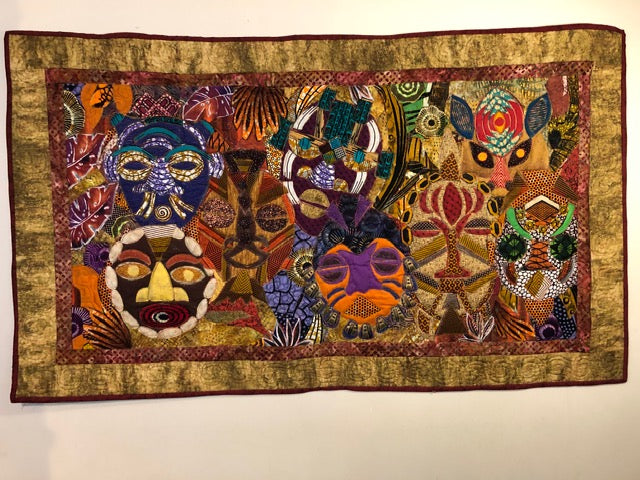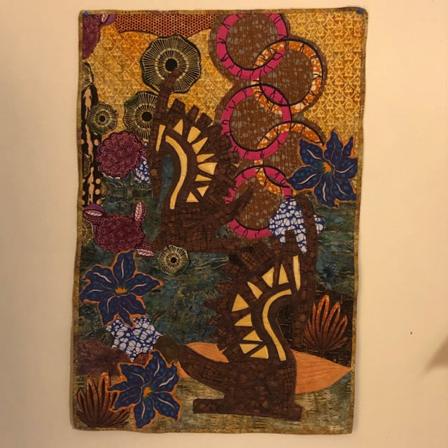 In this quilt I feature the two ritual Chiwara antelope figures. Used in initiation ceremonies for young men by the Bambara people of Mali to teach them social values as well as the fundamentals of agriculture.