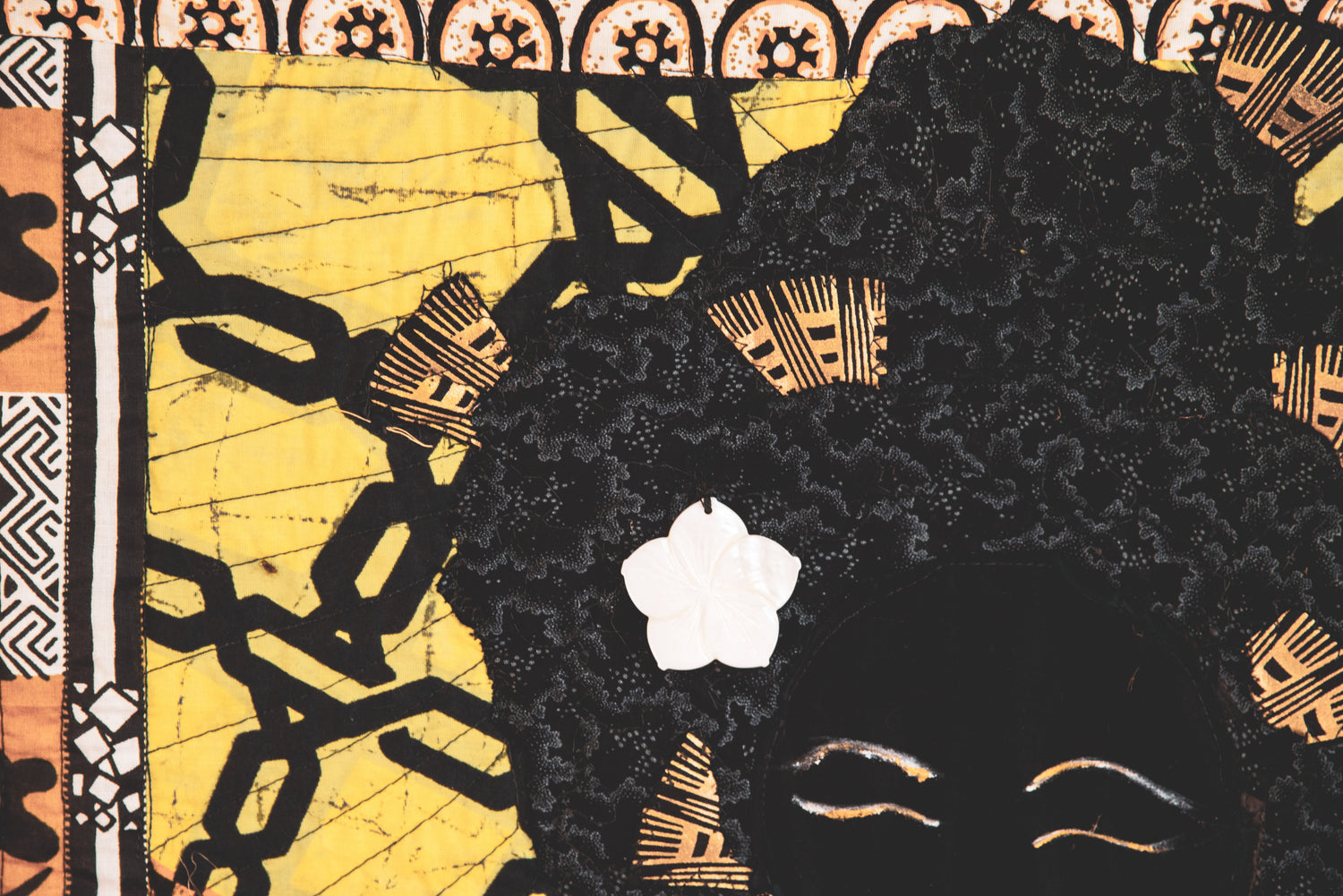 This quilt was shown at BYN Mellon Gallery in conjunction with an exhibit by the artist Sonya Clarke who uses black hair as thematic thru line in her art.
